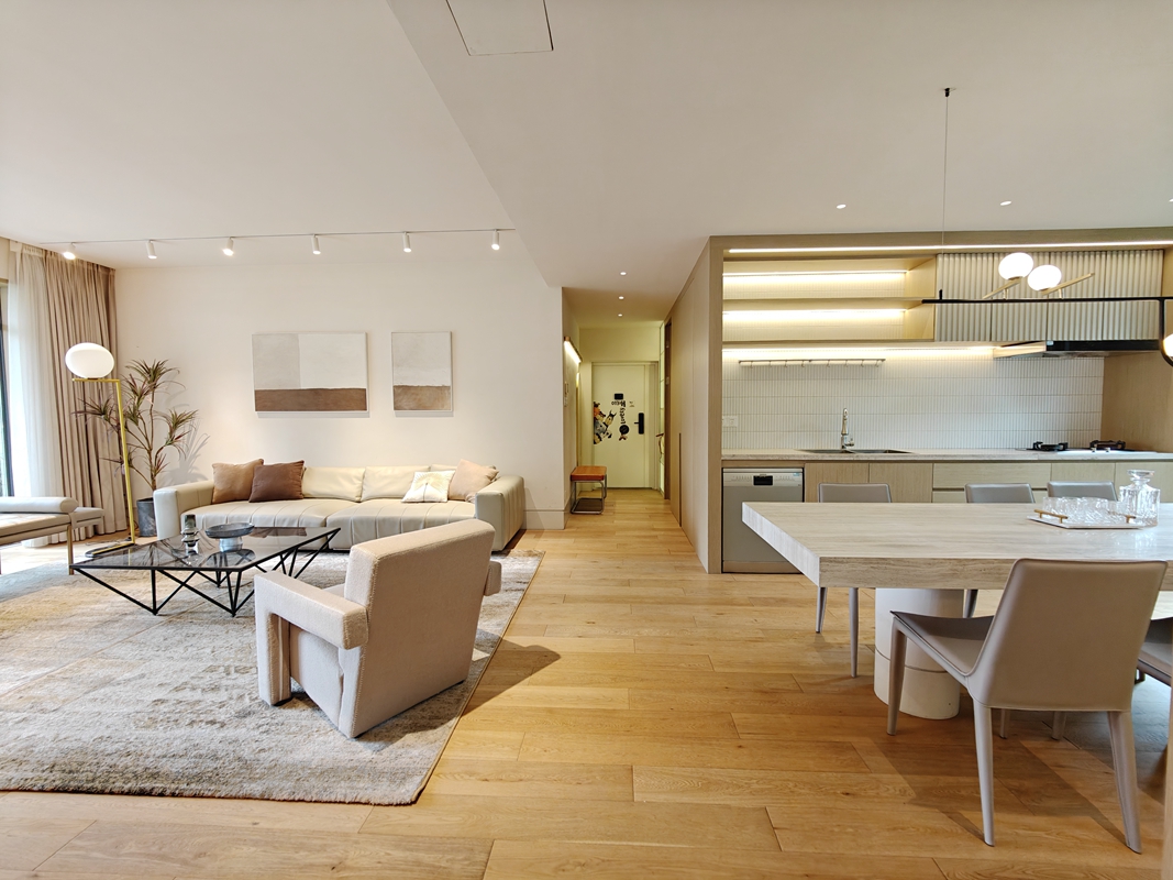 This apartment features open balcony, floor heating, central A/C and open kitchen with oven, dish washer.