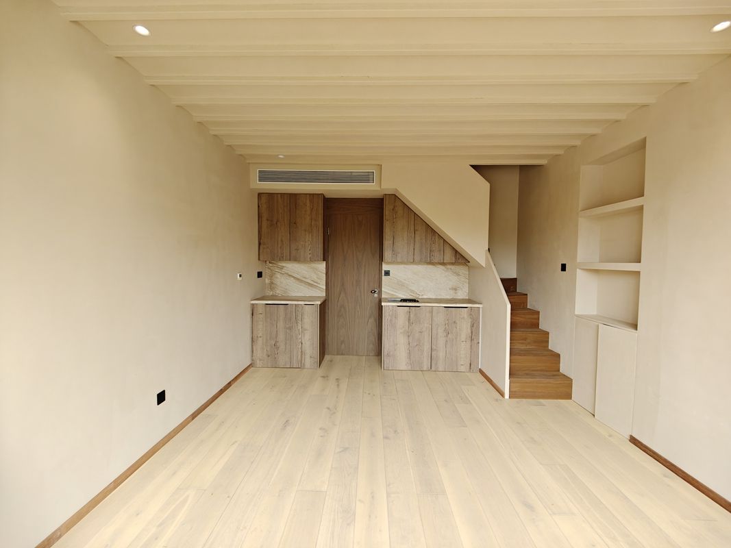This duplex apartment features central A/C and open kitchen.