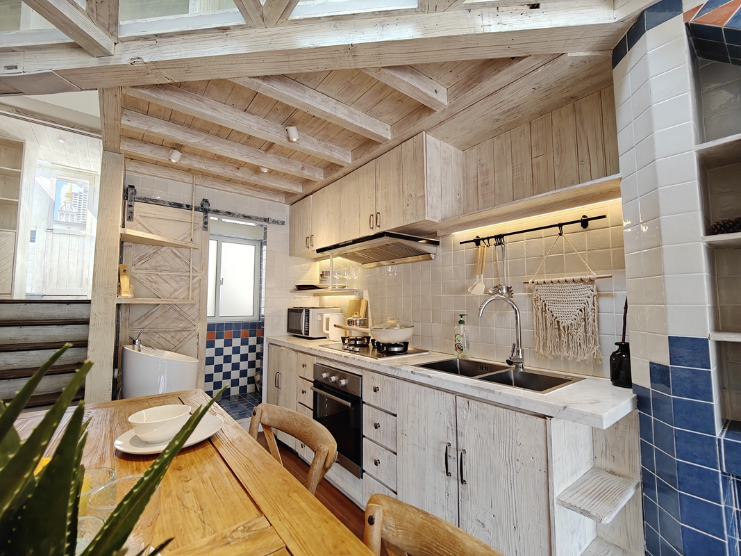 This duplex lane house features open balcony, terrace and open kitchen with oven.
